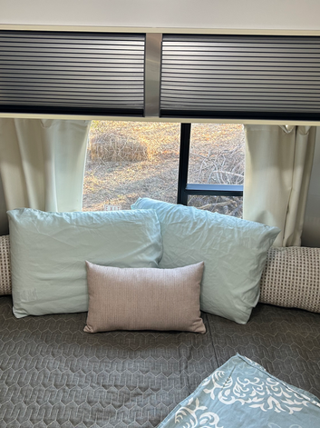 2 Rise Performance pillows, 4 long buffer pillows, original bedspread, decorative staging pillows.